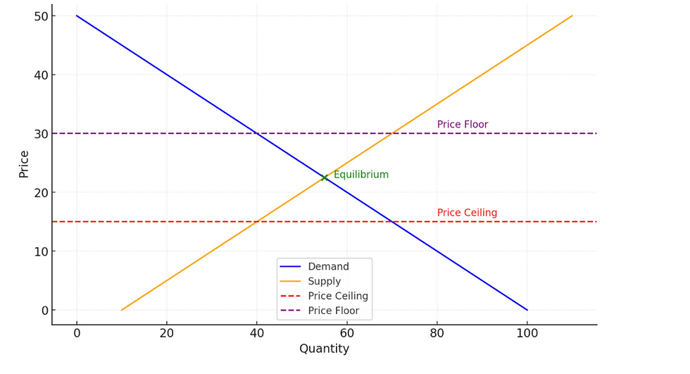 Price Ceilings: Maximum price below equilibrium (e.g., rent control).Done by the government to make the product more affordable for the public, imposed on items such as food and medicine